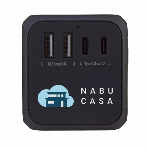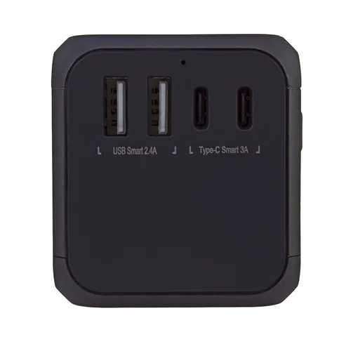 A travel adapter that is perfect for teams that need to travel often for business. Comes with Type-C ports and two USB ports that allow you to charge multiple devices simultaneously. Features: Covers more than 150 countries with US/EU/UK/AUS plugs Built-in safety shutters protect users from the direct touch of the live parts on the socket outlet Only one plug-type can be used at one time by sliding the knob selection, other plug-pins are locked automatically