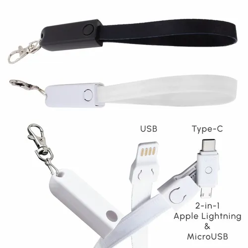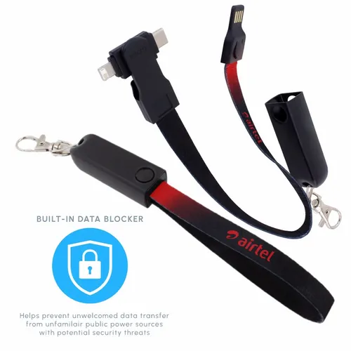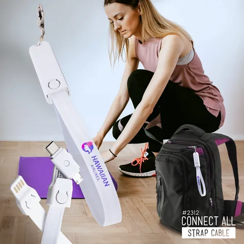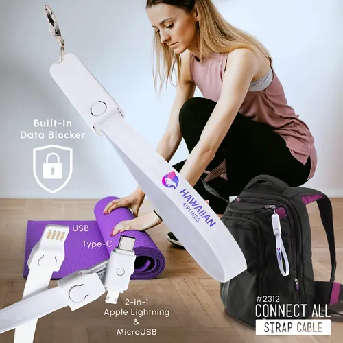 Connect All Strap Cable is compatible with Micro USB Android, Type C Android and iPhone. With built-in data block feature, you can charge safely and securely in public. Fashionable and Convenient with nice full color branding area on the fabric strap. Optional decorating area on the cap. Attach it on your belt loop, backpack, tote, purse, etc. Great giveaway item that customers will carry it and use it everyday.