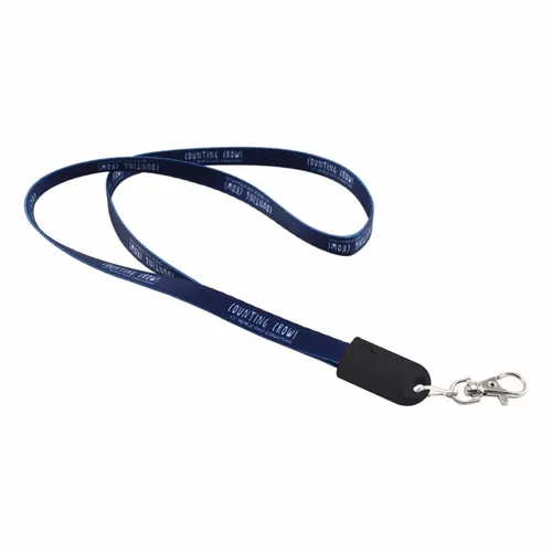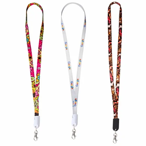 The perfect item for conventions, trade shows, and sporting events! The Fabric Lanyard Charging Cable provides a comfortable strap to keep your badge, keys, etc on your neck. Simply detach the keychain clip and the lanyard becomes 3' charging cable that is compatible with most Android and other devices. The 3' cable is full-color print capable to clearly display your client's logo!