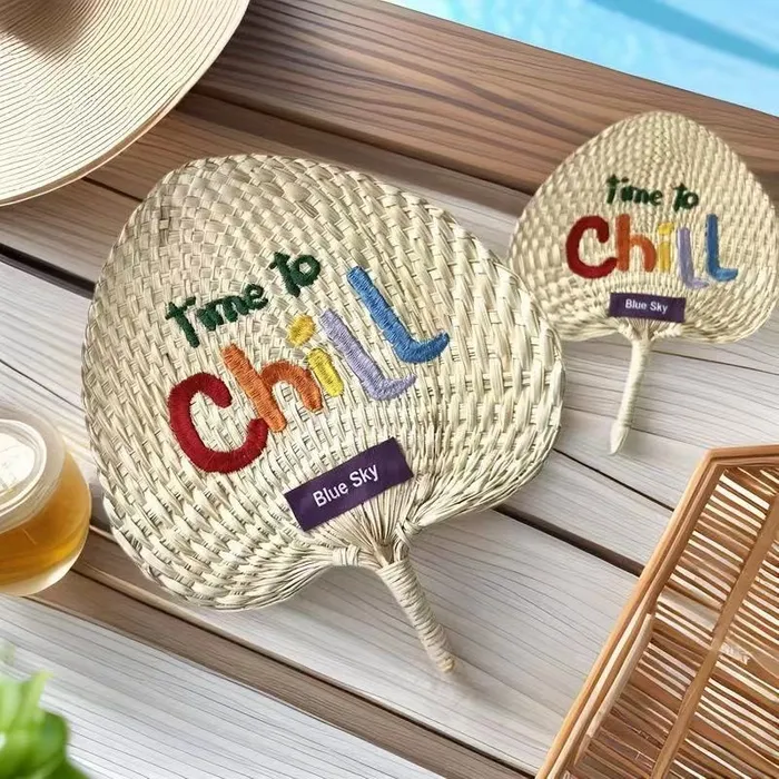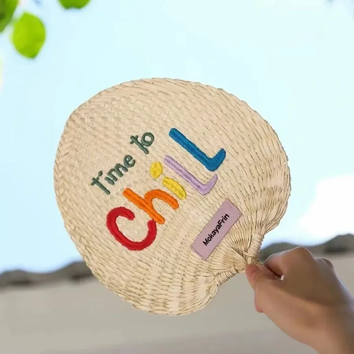 A custom woven hand fan is a 100% natural fan handcrafted from fragrant reed and typha cattail, featuring a biodegradable, eco-friendly design with no chemical additives. Available in circular and peach heart shapes, these fans measure 8.7 inches and offer a unique, skin-friendly texture that highlights both sustainability and style.
