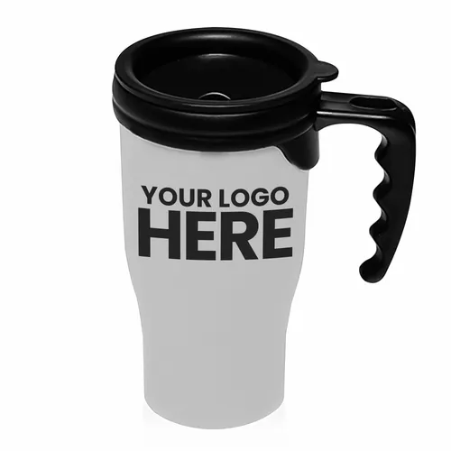 14 oz. Color Acrylic Outer Shell Insulated Travel Mugs. Acrylic Insulated Inner Liner. Plastic Lid with Spill Prevention Slide Lock. Easy Grab-n-Go Hook Shaped Handle