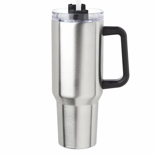 40 oz. Capacity. Slider Transparent Lid with Straw Included. Double Wall Stainless Steel to Hold Temperature. Vacuum Insulated. Easy Grip Handle to Grab-n-Go. Measurement with Lid is 10" H, Straw: 0.25" W x 12" H. Wide Mouth for Easy Cleaning and Pouring Drinks. Keeps Hot for Approximate 6 Hours, Cold for 10 Hours