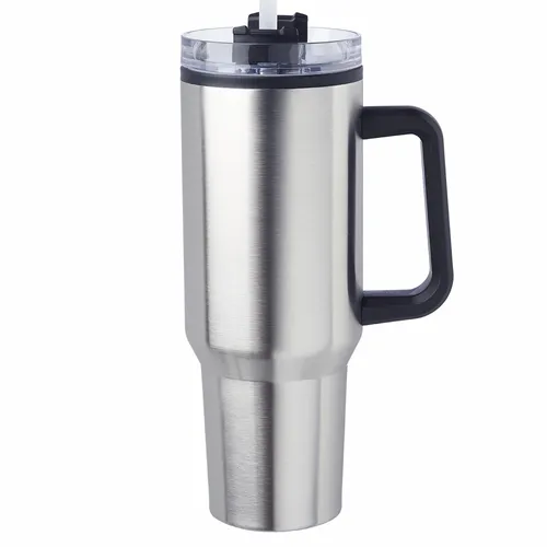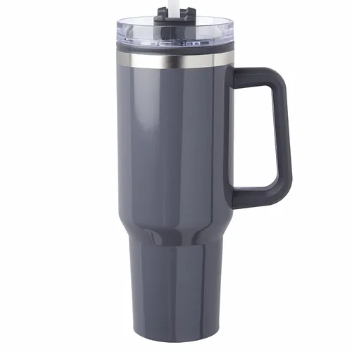 40 oz. Capacity. Slider Transparent Lid with Straw Included. Stainless Steel Exterior and Plastic Interior. Easy Grip to Grab-n-Go. EVA Bottom Pad. Wide Mouth for Easy Cleaning and Pouring Drinks