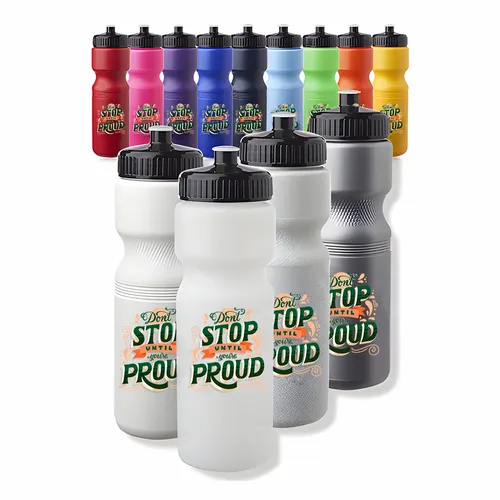 This 28 oz Hydro Mate Easy Push Cap Water Bottles is made of durable, high-density colored polyethylene material and has a good grip action bottle with a ridged cap. The easy-flow colored drinking push cap makes it easy to take a sip, even when you're on the go. The caps do not come assembled on the bottles, so you can customize them with your own logo or design. Order yours today and stay hydrated in style with this amazing drinkware!! Specifications