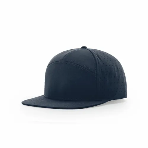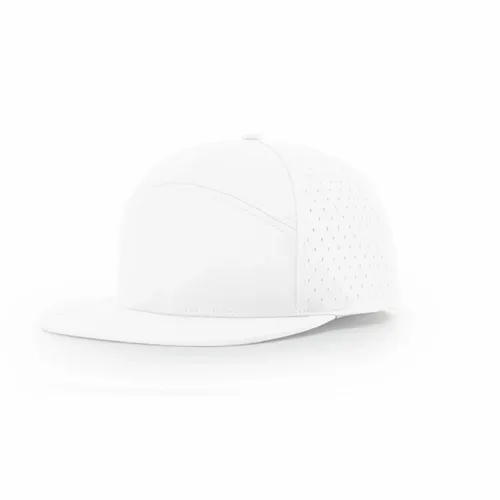 98% Polyester/2% Spandex Stretch Performance Polyester Fabric Water-resistant Material Perforated Laser Cut Side and Back Panels Structured, Seven-panel, Hi Pro Profile Flat Bill Stay Dri Performance Sweatband Adjustable Snapback Closure