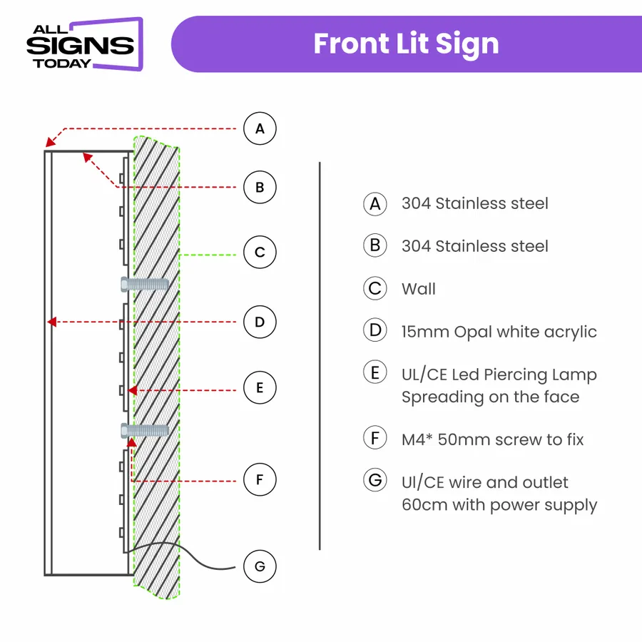 Our Frontlit Sign With Punch Holess features strategically placed punch Holess that add a touch of creativity and visual interest. These punch Holess create a stunning visual effect when combined with the vibrant LED lights, resulting in a sign that is both captivating and dynamic.