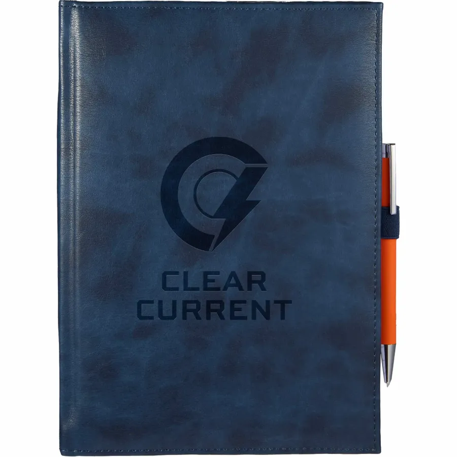 The 7 x 10 FSC Recycled Morano Large Journal features a marbled cover crafted from 30% recycled post-consumer polyester and 70% polyurethane. Inside, it includes 128 sheets of lined FSC recycled paper, offering a smooth, eco-conscious writing experience. Two ribbon page markers help you keep track of important notes, while the color-matching pen loop adds convenience and style. With the JournalBooks logo embossed on the back cover, this journal is both professional and environmentally friendly. Pen is not included. By choosing this notebook, you’re making a positive impact on the environment through a partnership with 1% For The Planet, as a portion of each sale supports environmental nonprofits.