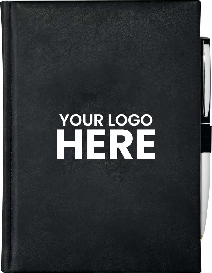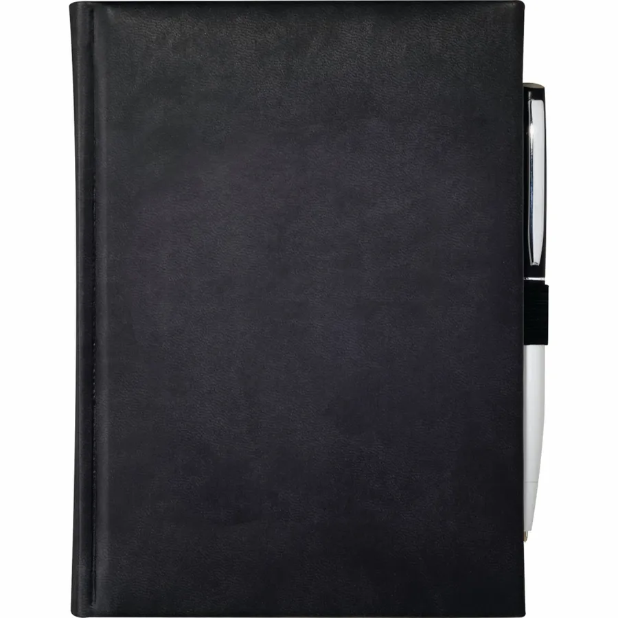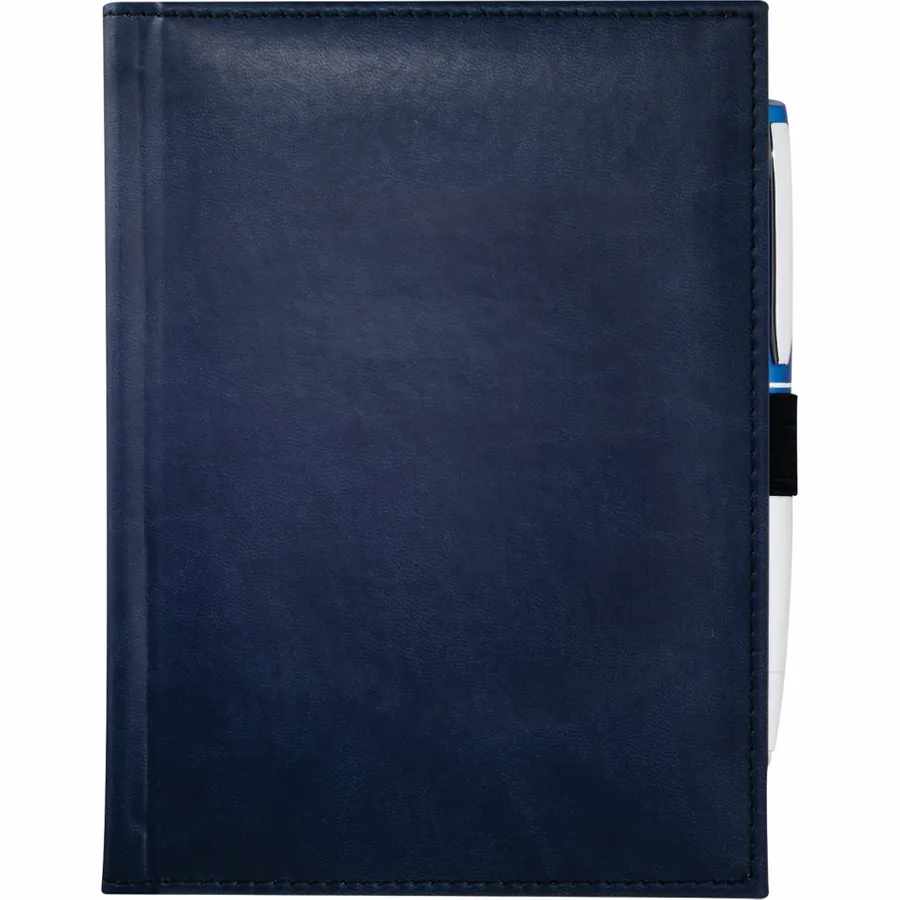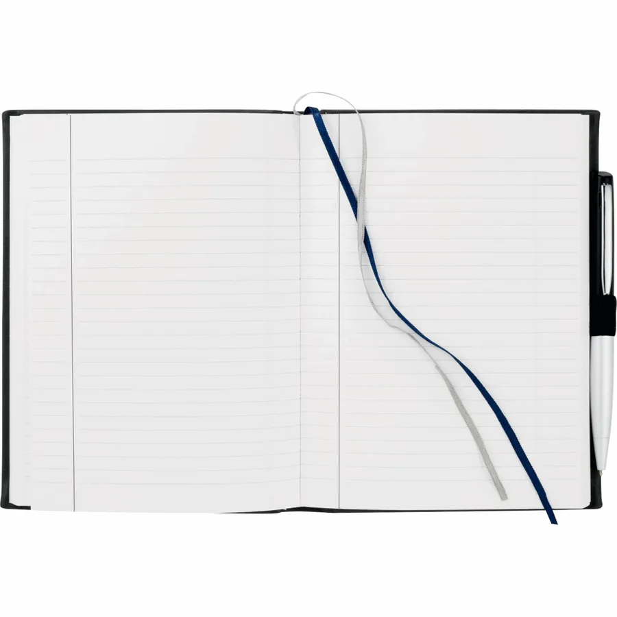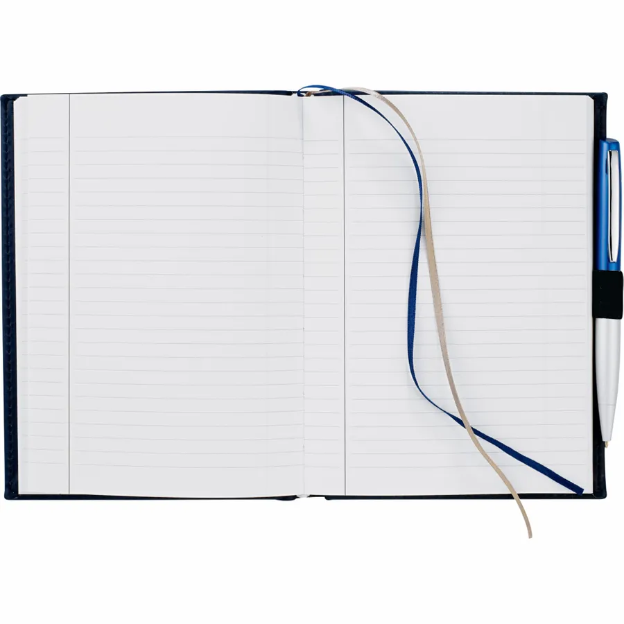The 5 x 7 FSC Mix Pedova™ Bound Journal is a hard cover, bound journal with an elastic pen loop (pen is not included). This specialty notebook features blue and silver ribbon page markers. The Pedova™ Bound Journal includes 125 sheets of white lined FSC Mix paper.