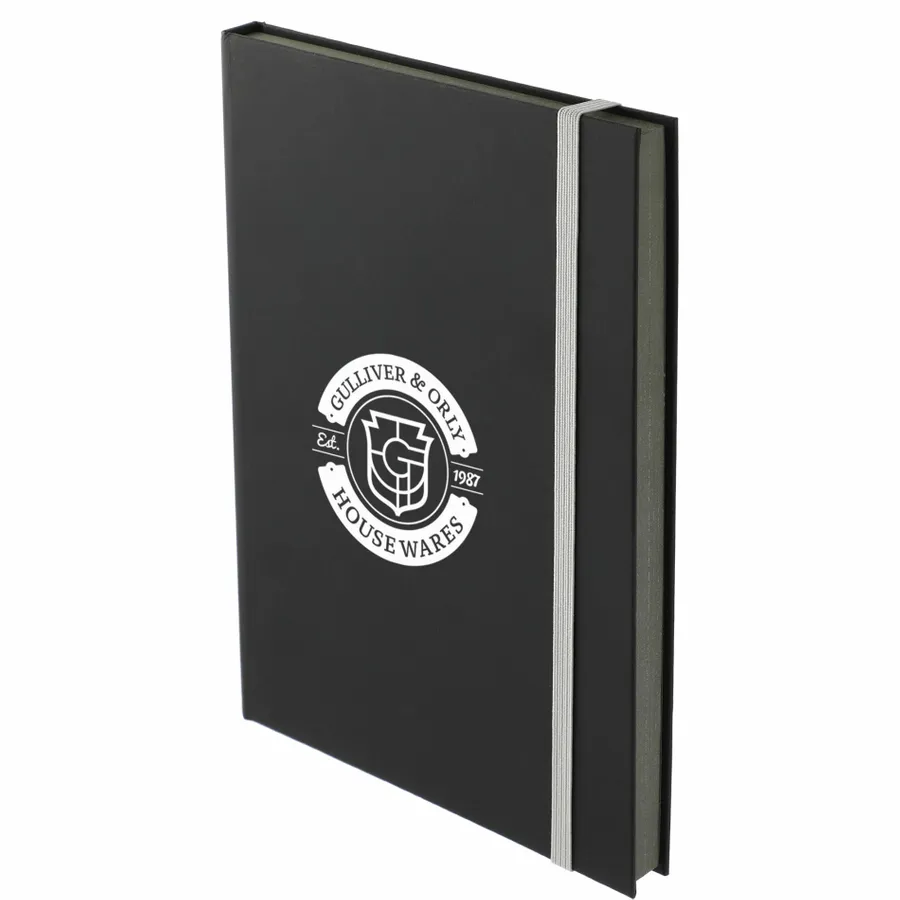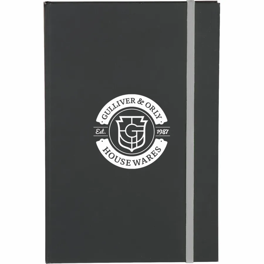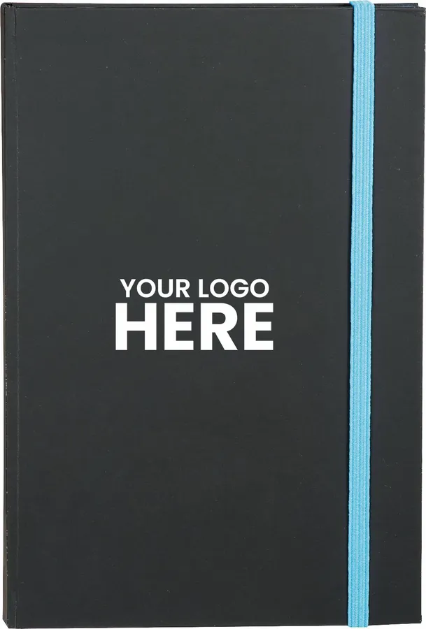 The 5.5 x 8.5 FSC Mix Color Pop Bound Journal features a hard cover with a soft matte black cover to highlight the most subtle or colorful logos. This custom Journal includes 96 sheets of FSC Mix cream lined paper with bright colored edges and corresponding color elastic closure.