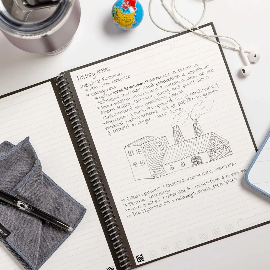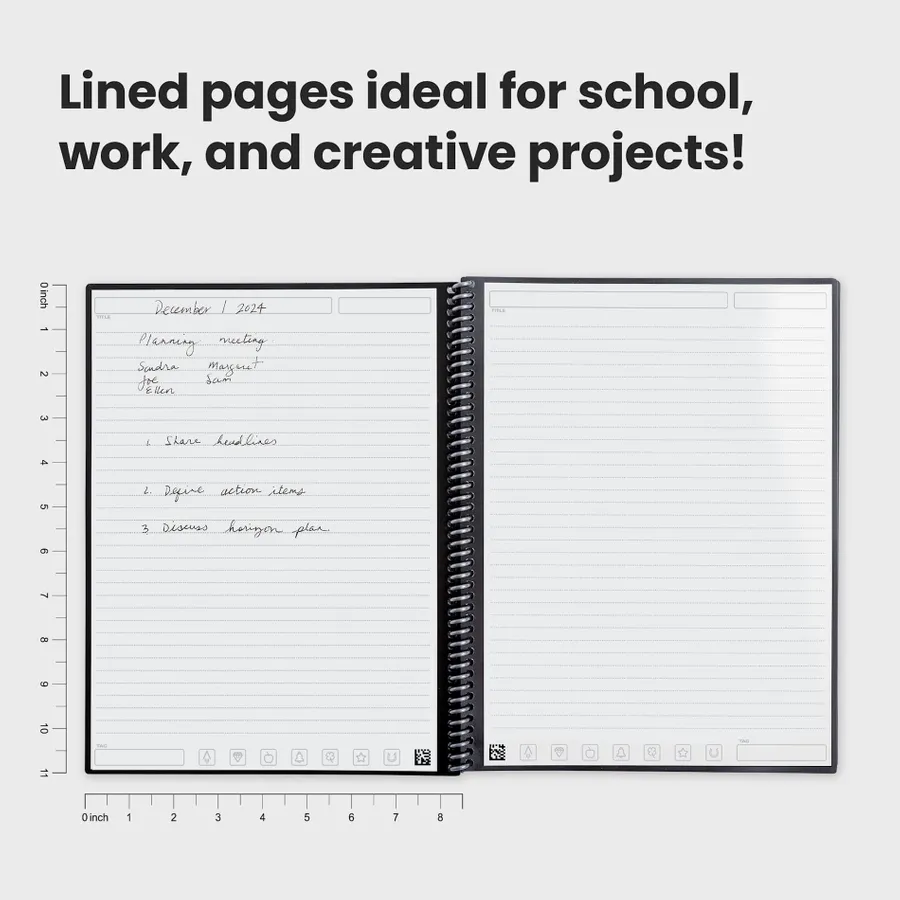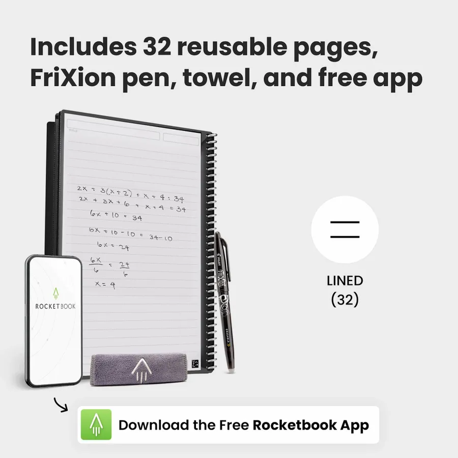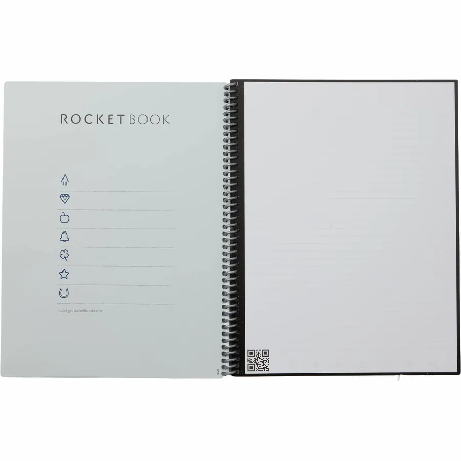The Rocketbook Core Letter Notebook Set is designed for every classroom, office, and personal mission. This set features a premium notebook with 32, lined reusable pages made to connect to your favorite cloud services. The Core is made with patented reusable Core technology. The synthetic paper allows you to write smoothly with a Pilot FriXion pen, then magically wipe clean with a damp cloth to reuse again and again! Scan and upload your written work directly to cloud platforms like Google Drive, Dropbox, OneNote, etc. and access your notes from anywhere. Use Smart Titles and Smart Tags to name and organize files efficiently.Then, erase and reuse your Core for your next adventure! This set includes Rocketbook Core Notebook, Pilot Frixion Erasable Pen, microfiber wipeable cloth, instruction manual and retail gift box.