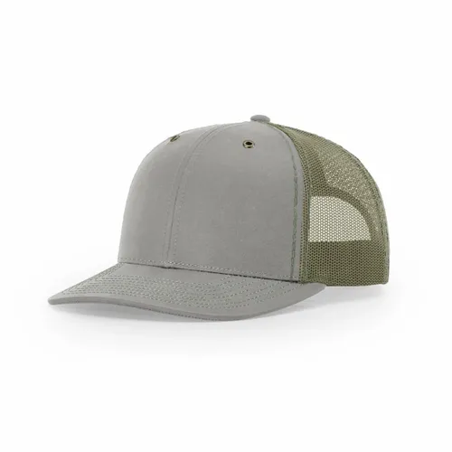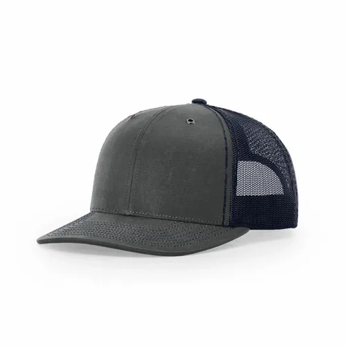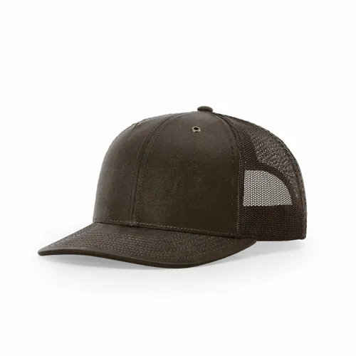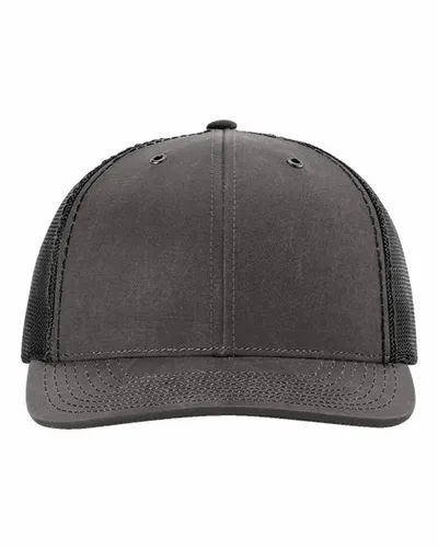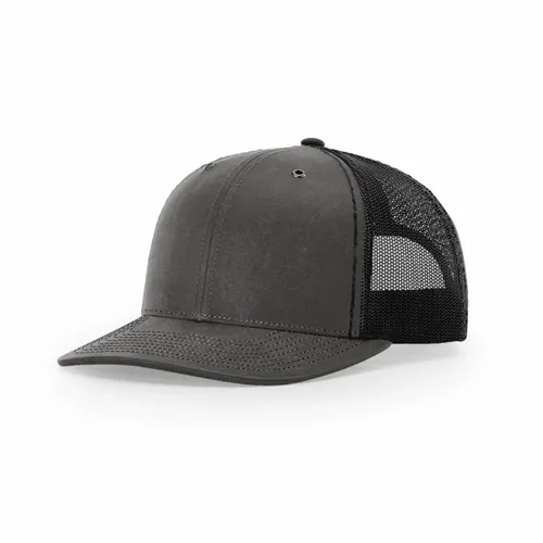 Front: 60% Cotton/33% Polyester/4% PU Spandex Back: 100% Polyester Coated Twill Oil Cloth Fabric, Trucker Mesh Structured, Six-panel, Mid Pro Profile Metal Eyelets on Front Panels Pre-curved Bill Adjustable Snapback Closure
