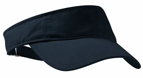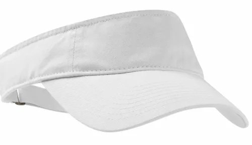 This 3-panel visor is enzyme washed for a lived-in look. The self-fabric sweatband folds down for easy decoration access. | Fabric: 100% washed cotton twill Closure: Hook and loop with metal buckle