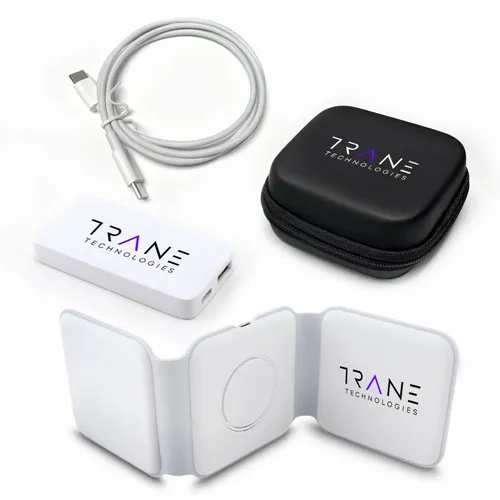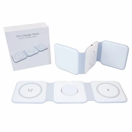 A travel kit for busy business teams that travel and need to keep multiple devices charged. It comes with our new Chi-Charge Stack(#2176, exclusively patented) that wirelessly charges a phone, Apple Watch, and AirPods, plus a USB-C and USB-A AC adapter(#2181) that comes with a Type-C power cord. Simply plug into a reliable power source and charge all three devices. Left Charging Pad: Apple or Android phones/Middle Charging Pad: Apple watch only/Right Charging Pad: Airpods or another phone.